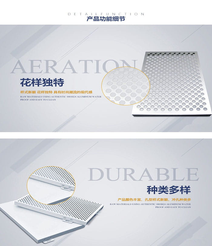 產(chǎn)品加工設(shè)備數(shù)控智能化,豐富了鋁單板的表面穿孔樣式,可以為不同建筑類型及裝飾設(shè)計需求定制各種各樣的穿孔鋁單板產(chǎn)品,讓更多的創(chuàng)意設(shè)計得到實現(xiàn)。這種仿木紋穿孔鋁單板可以板面穿孔的基礎(chǔ)上用不同規(guī)格的孔徑和排列表現(xiàn)出豐富的圖案,讓普通的金屬鋁板變得生動,也讓室內(nèi)增加了藝術(shù)元素。木紋鋁單板圖案豐富,效果逼真,紋理清晰。木紋鋁單板防火性、防腐性、防潮性、硬度和強(qiáng)度都是實木無法相比的。木紋鋁單板使用壽命長,能保持10-15年不變色,不變形。仿木紋鋁單板,可應(yīng)用于室內(nèi)吊頂與墻面裝飾。氟碳鋁單板憑其優(yōu)越的耐候性、耐腐蝕性、質(zhì)輕美觀、安裝方便等優(yōu)點被廣泛使用,現(xiàn)已成為大型建筑室外裝飾的新型環(huán)保材料。氟碳鋁單板優(yōu)越的環(huán)保性和可塑性是其它建筑材料不可替代的,因此深受建筑設(shè)計師的追捧。